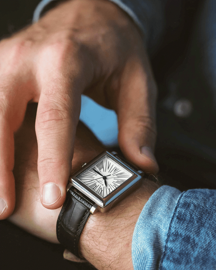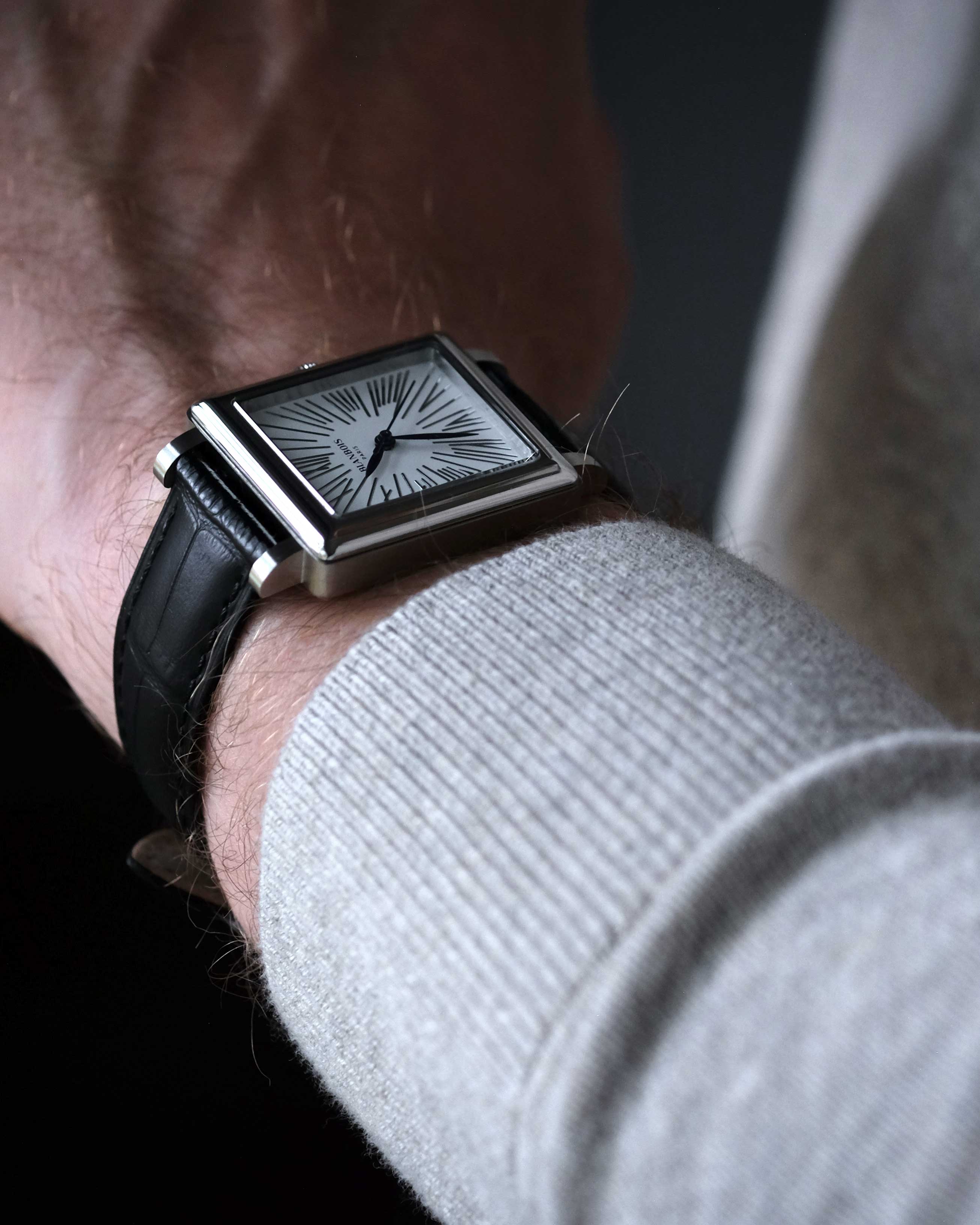 " The rectangular shape reminds me of watches from the 40s, but it doesn't feel like a reproduction. It's its own thing. The proportions work really well on the wrist, not too big or too small. "